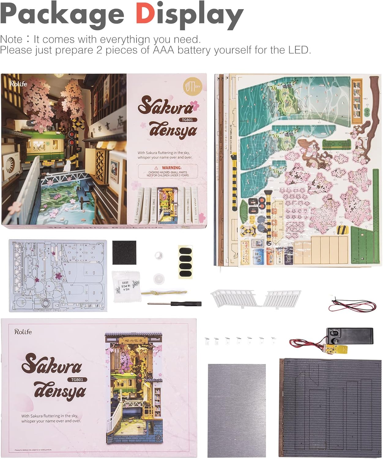 Rolife DIY Book Nook Kit 3D Wooden Puzzle for Adults 8.7 Bookshelf Indert Decor with LED Miniature Dollhouse Kit Bookend Crafts Diorama Hobbies Gifts for Women Men (Sakura Densya)
